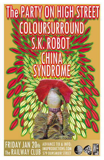 . Friday, January 20th IMU presents The PARTY ON HIGH STREET, COLOURSURROUND, SK ROBOT & CHINA SYNDROME @ The Railway Club, 579 Dunsmuir . Doors 9pm / Purchase advance tickets online @ http://www.imuproductions.com/tix