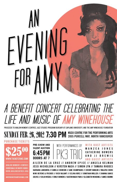 An Evening For Amy: Manzea Jones, Catherine Bowers, JJ Brewis, PK3 Trio, Andrew Spice, Aileen de la Cruz, Jessi Nicholson, Angela Kelman @ NSCU Centre For the Performing Arts Feb 26 2012 - Jan 28th @ NSCU Centre For the Performing Arts