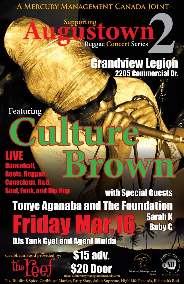 Culture Brown is an energizing Jamaican Reggae artist who has been described as sitting musically somewhere between Shabba Ranks and Buju Banton. With five albums behind him, Culture Brown has a global following second to none. Having toured, North America, Europe, and the caribbean, his electric stage presence is contagious , as he dares his audiences right off their feet, and into his music.