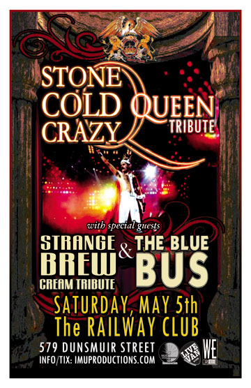 . Saturday, May 5th IMU presents STONE COLD CRAZY Queen Tribute, STRANGE BREW Cream Tribute & The BLUE BUS @ The Railway Club, 579 Dunsmuir . Doors 9pm / Purchase advance tickets online @ http://www.imuproductions.com/tix