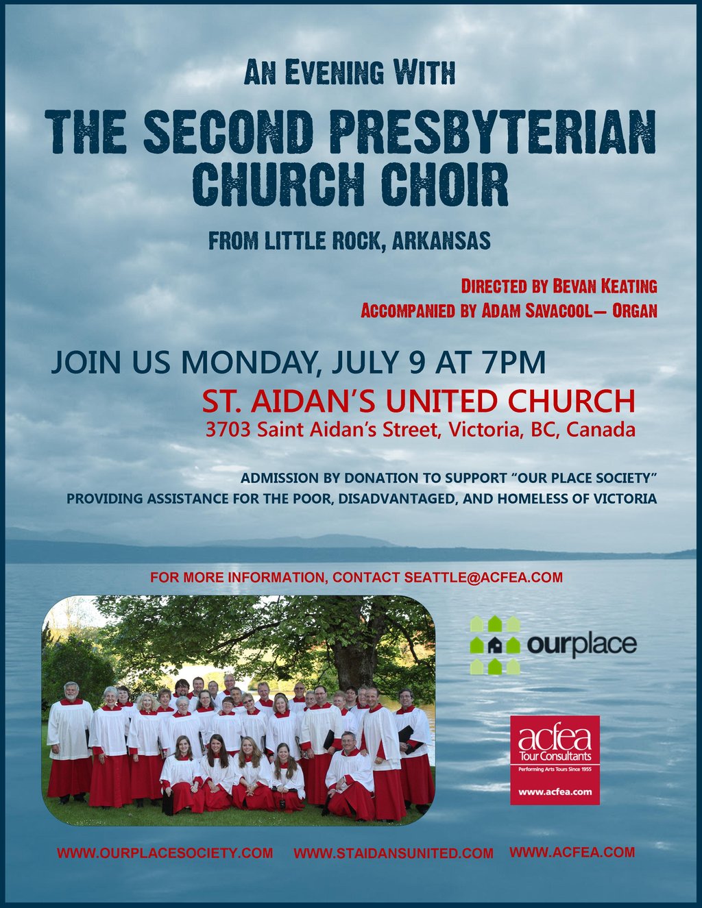 Join the Second Presbyterian Church on this tour represent the Church Choir during their tour of Western Canada for this one-night-only benefit concert. Proceeds from donations will be donated to the Our Place Society, assisting the poor, homeless, and disadvantaged of Victoria.