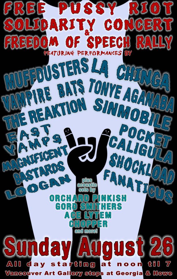 In light of the recent events surrounding the imprisonment of the Russian band Pussy Riot for their expression of dissent against a patriarchal and oppressive state rule, we are organizing a free, all day solidarity concert / freedom of speech rally for this Sunday August 26th at the Vancouver Art Gallery steps (Georgia plaza)