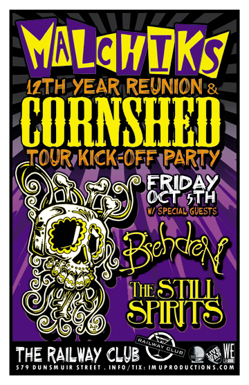 . Friday, October 5th IMU presents The MALCHICKS 12th YEAR REUNION & CORNSHED TOUR KICK-OFF w/ special guests BREHDREN & The STILL SPIRITS @ The Railway Club, 579 Dunsmuir . Doors 9pm / Purchase advance tickets online @ http://www.imuproductions.com/tix