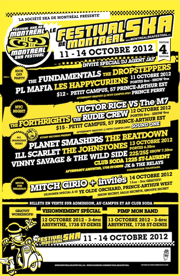 Montreal Ska Festival rides again October 11th - 14th, 2012 at Petit Campus and other venues. This year's line-up includes The Planet Smashers, Victor Rice, The Fundamentals, The Beatdown, Prince Perry and more!