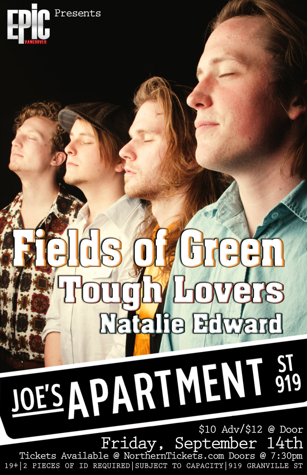 2012 Fox Seeds Platinum Award Winners Fields of Green are taking the stage at Joes Apartment just one week after their big win at The Commodore Ballroom. Soon to be on tour with The Arkells, don't miss the opportunity to check them out on a local stage. Peak Performance Project contestants Tough Lovers will be performing before the headliner, along with local independent artist Natalie Edward.