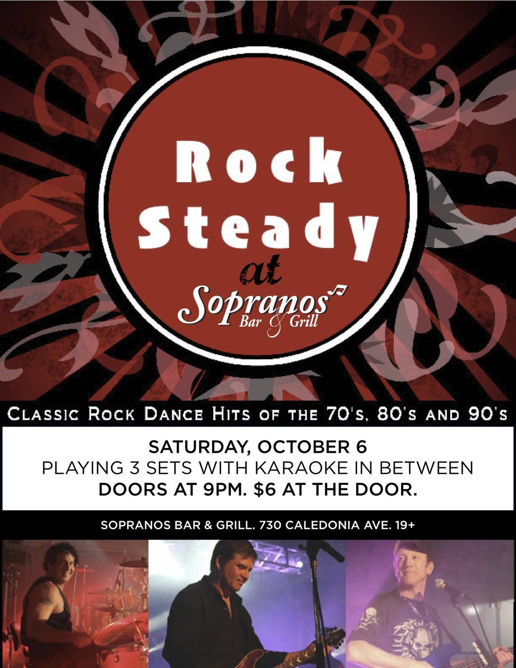 oin us down at Soprano's for our Saturday October 6th to party with live music by Rock Steady performing 3 sets with hits from the 70's, 80's, & 90's. Karaoke in between sets. $7 at the door. Our Kitchen is open late!