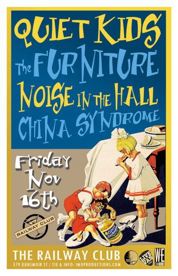 . Friday, November 16th IMU presents QUIET KIDS, The FURNITURE, NOISE IN THE HALL & CHINA SYNDROME @ The Railway Club, 579 Dunsmuir . Doors 9pm / Purchase advance tickets online @ http://www.imuproductions.com/tix