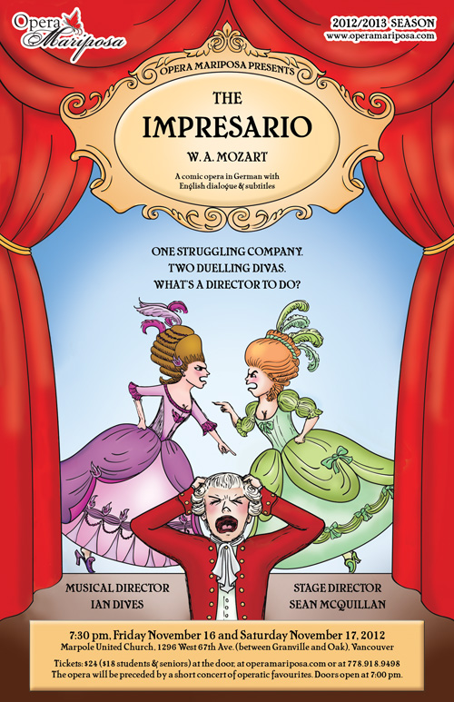 Opera Mariposa is officially launching its first full season with a delightful (and appropriate!) comic opera about the struggles involved in running a small opera company. Mozart’s 'The Impresario' follows the trials and tribulations of an unfortunate opera director as he attempts to organize a show season while juggling financial woes, temperamental performers and his own existential crisis. The poor impresario finds himself caught in the middle when two difficult divas become determined to prove their own superiority… and the conflict escalates into a spirited musical duel as each prima donna competes to sing the highest notes and the fanciest music!