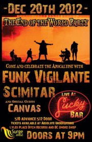 Come celebrate the End Times with FUNK VIGILANTE and SCIMITAR and the brand new act CANVAS for the last party the world will ever see! And what better place to throw down once and for all then at LUCKY BAR!