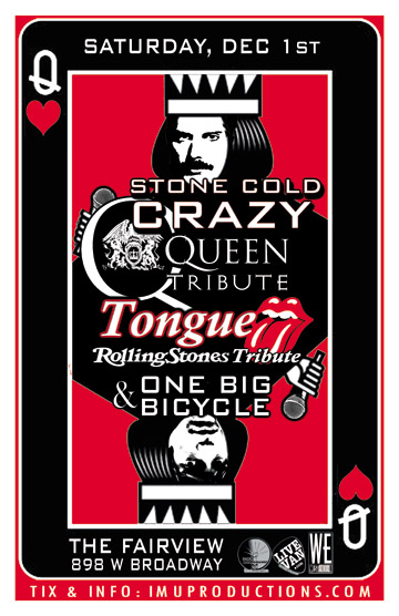 . Saturday, December 1st IMU presents STONE COLD CRAZY Queen Tribute, TONGUE Rolling Stones Tribute & ONE BIG BICYCLE @ The Fairview, 898 West Broadway . Doors 9pm / Purchase advance tickets directly online @ http://www.imuproductions.com/tix