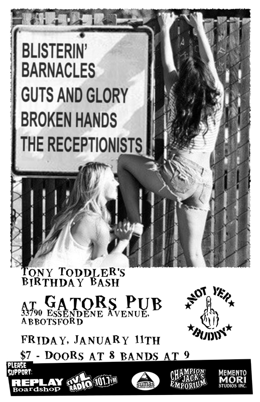 Tony Toddler's BDAY Bash with: Blisterin Barnacles, Guts and Glory, The Broken Hands, The Receptionists @ Gator's Pub Jan 11 2013 - Jan 15th @ Gator's Pub