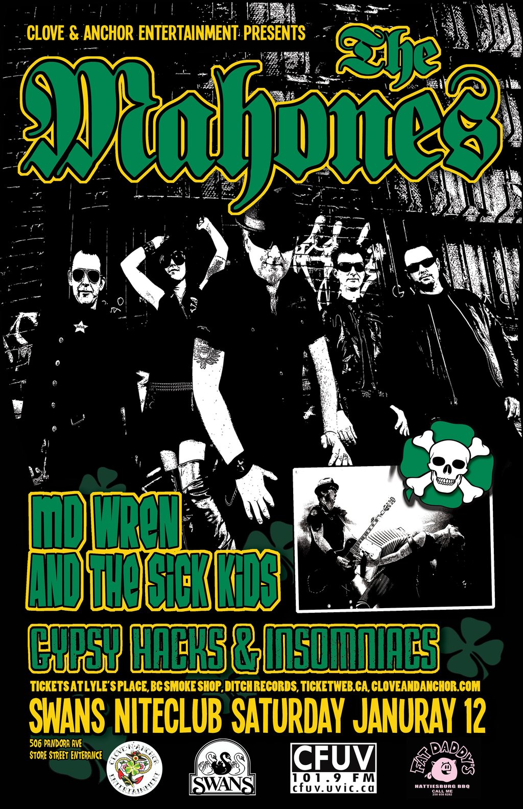 The Mahones are celebrating their 23rd anniversary and putting out their 8th studio album this November. They're about to embark on a support US/Canada tour with The Dropkick Murphys (3rd in a row) and then on a Coast to Coast headlining run across the country. Joining them are Victoria's own MD Wren & the Sick Kids the infectious experiment in barn-burning, knee-slapping, country cowpunk and Gypsy Hanks & Insomniacs a dark, heavy, folk, gypsy sound that leaves you wanting more! Tickets $11 in advance at Lyle's Place, BC Smoke Shop, Ditch Records & ticketweb.ca.