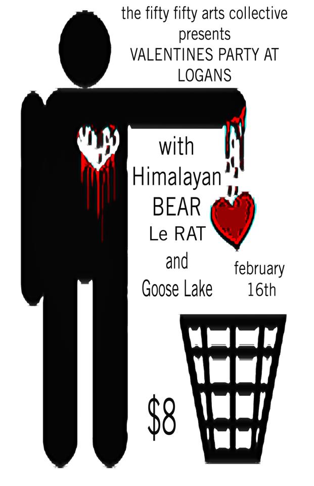 The Fifty Fifty Arts Collective Valentine's Party featuring:: The Himalayan Bear, Goose Lake, Le Rat @ Logan's Pub Feb 16 2013 - Mar 16th @ Logan's Pub