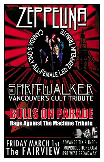 . Friday, March 1st IMU presents ZEPPELINA Canada's Only All-Female Led Zeppelin Tribute, SPIRITWALKER Cult Tribute & BULLS ON PARADE Rage Against The Machine Tribute @ The Fairview, 898 West Broadway . Doors 8pm / Purchase advance tickets online @ http://www.imuproductions.com/tix