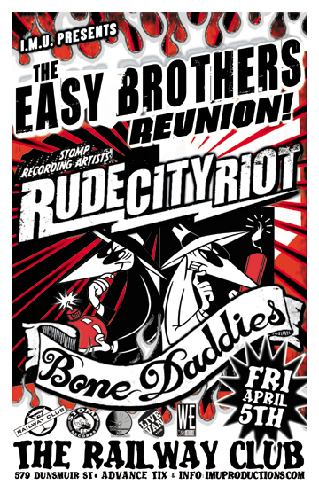 . Friday April 5th IMU presents The EASY BROTHERS REUNION w/ RUDE CITY RIOT & The BONE DADDIES @ The Railway Club, 579 Dunsmuir . Doors 9pm / Purchase advance tickets online @ http://www.imuproductions.com/tix