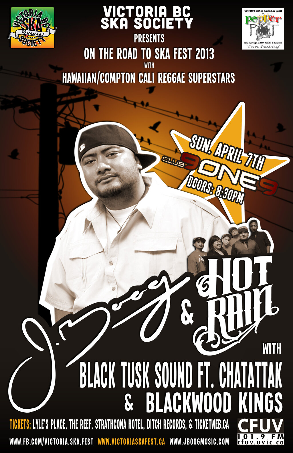 Sunday, April 7th at Club 9ONE9 Victoria BC Ska Society & Pepperpot - Victoria's Hypest Caribbean Radio are excited to present ON THE ROAD TO SKA FEST 2013 featuring Hawaii/Compton, Cali Reggae Legend J BOOG & HOT RAIN for the first time to the Island!