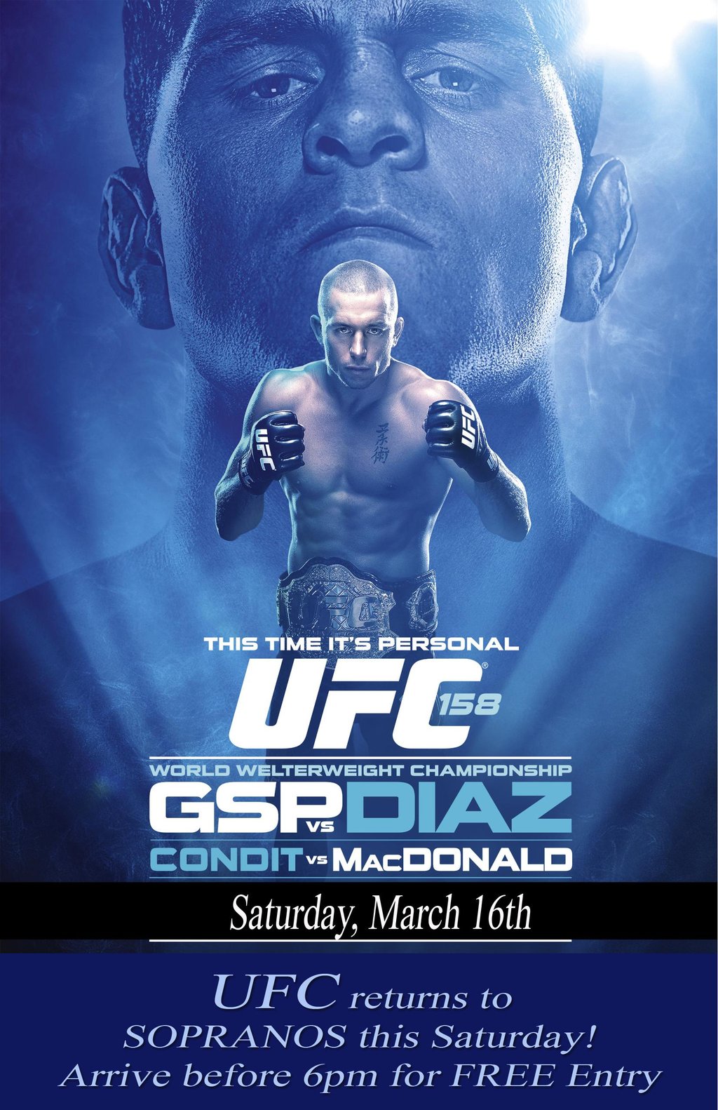 This Saturday at Soprano's watch UFC Fight Georges St-Pierre VS. Nick Diaz on ou...