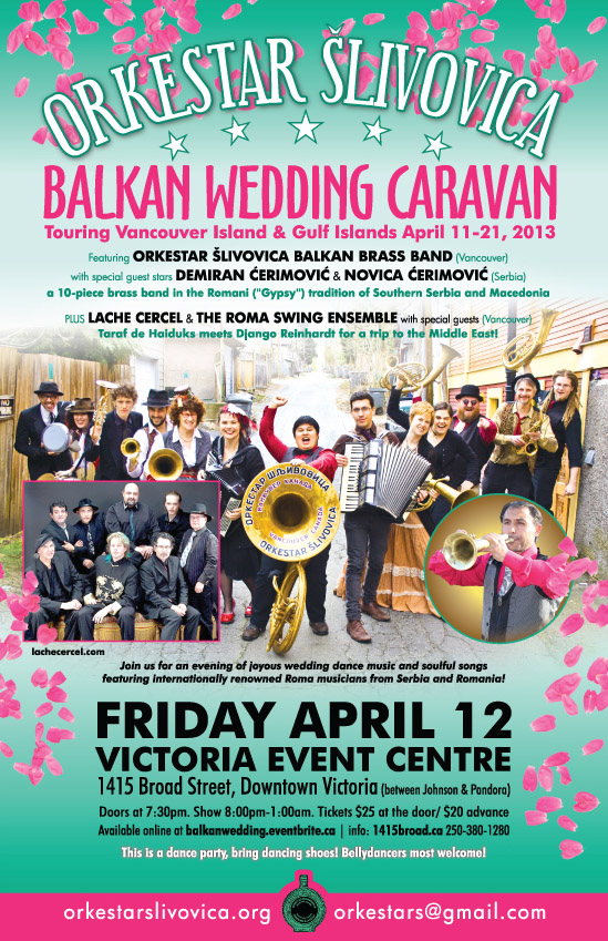 Tour dates: Friday April 12 - Victoria, Saturday April 13 - Duncan, Sunday April 14 - Hornby Island, Thursday April 18 - Port Alberni, Friday April 19 - Lasqueti Island, Saturday April 20 - Comox, Sunday April 21 - Nanaimo. There may be additional daytime performances. Also on May 3 and 4 in Vancouver with Kočani Orkestar from Macedonia and other guest bands.