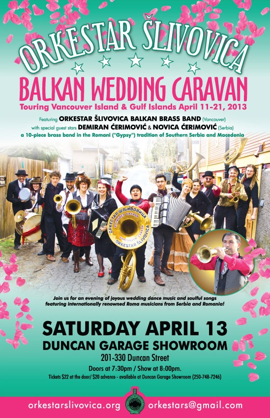 Tour dates: Friday April 12 - Victoria, Saturday April 13 - Duncan, Sunday April 14 - Hornby Island, Thursday April 18 - Port Alberni, Friday April 19 - Lasqueti Island, Saturday April 20 - Comox, Sunday April 21 - Nanaimo. There may be additional daytime performances. Also on May 3 and 4 in Vancouver with Kočani Orkestar from Macedonia and other guest bands.