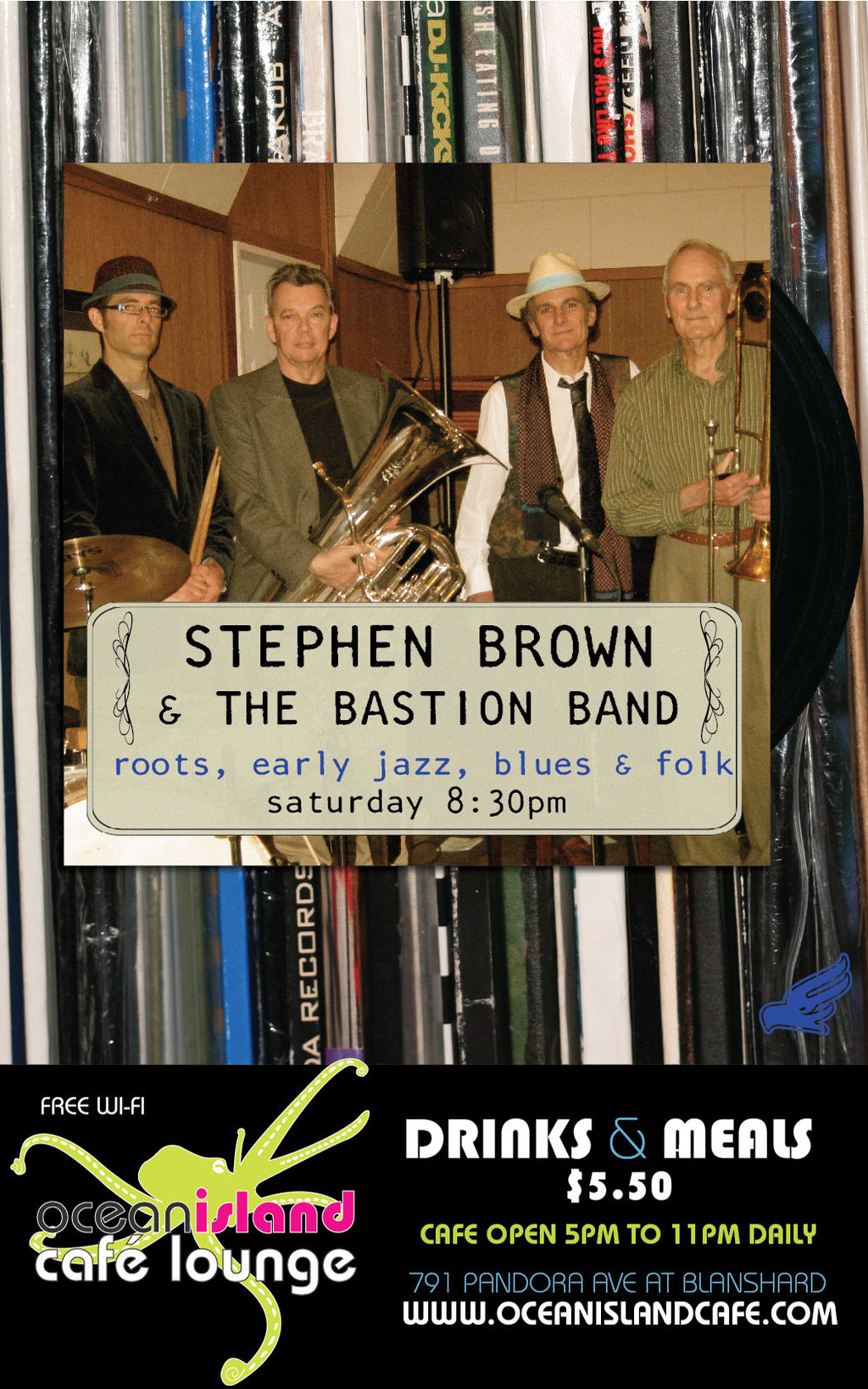 Victoria musicians Stephen Brown - piano, guitar, vocals, Denny Box - drums, Alf Sleigh (now from Tsawwassen) - trombone, Eugene Dowling - tuba, and when he can make it, Aaron Watson - guitar, accordion, and saw, perform traditional New Orleans jazz, spirituals, & blues, roots country, & rock every Saturday at Ocean Island Cafe Lounge.