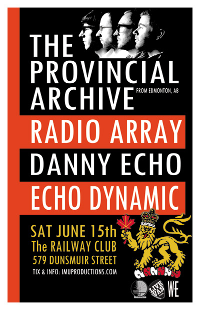 . Saturday, June 15th IMU presents The PROVINCIAL ARCHIVE, RADIO ARRAY, DANNY ECHO & ECHO DYNAMIC @ The Railway Club, 579 Dunsmuir . Doors 9pm / Purchase advance tickets online @ http://www.imuproductions.com/tix