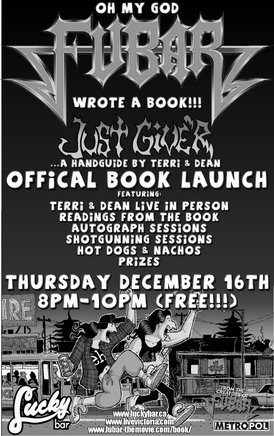 Terry & Dean from FUBAR wrote a book! "Just Give'r" is a "...handguide to life, love, and the pursuit of givin'r". This is a special event - no cover. If you were at (or heard about) the FUBAR Creep'r show, you know that this will be fuck'n righteous! You can pick up the book, get it scribbled on by the authors themselves, hear readings, win prizes, eat nachos and hotdogs... and JUST GIVE'R!!!