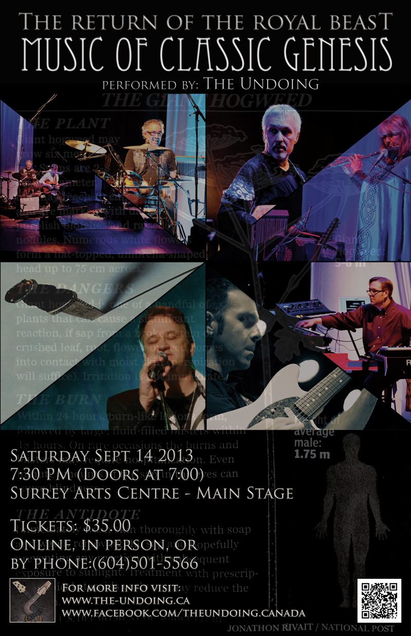 A dynamic and energetic retrospective concert of classic Genesis music from the 1970’s will be performed by The Undoing, a full 6 piece rock band featuring double-neck guitar/bass, bass pedals, 12-string guitars, flute, vocals, mellotron, synthesizers, organ, piano, drums and percussion.