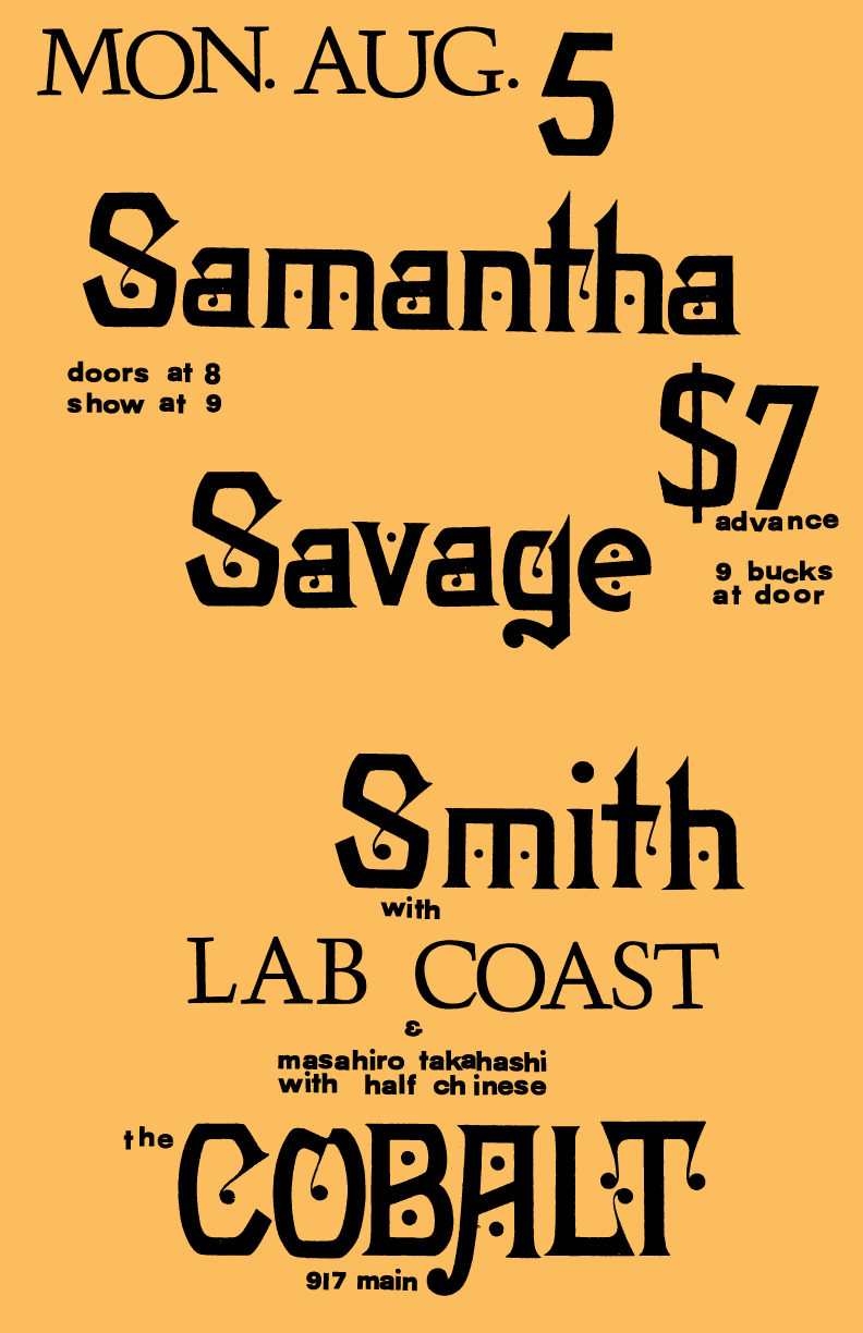 Samantha Savage Smith, Lab Coast, Masahiro Takahashi, Half Chinese @ The Cobalt Aug 5 2013 - Jan 18th @ The Cobalt