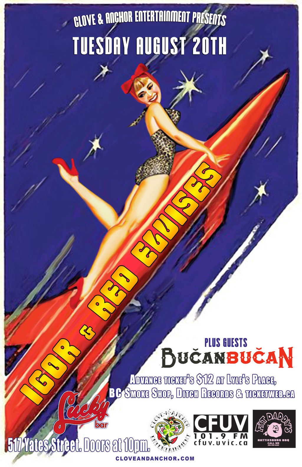 Tuesday August 20th get on down to catch "Siberian Surf Rock" Igor & Red Elvises this group is constantly in motion and consistently evolving. Igor & Red Elvises are your new favorite party band! Joining them are Victoria's own gypsy marching band Bučan Bučan! Tickets $12 on sale Lyle's Place, Ditch Records, BC Smoke Shop (no service charge), & ticketweb.ca.