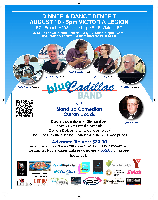 Autism Awareness Benefit Campaign fundraiser for the 2013 International Naturally Autistic Peoples Awards. Dinner at 6 pm, comedian Curran Dobbs at 7 pm, live blues music with the Blue Cadillac Band at 8 pm, silent auction