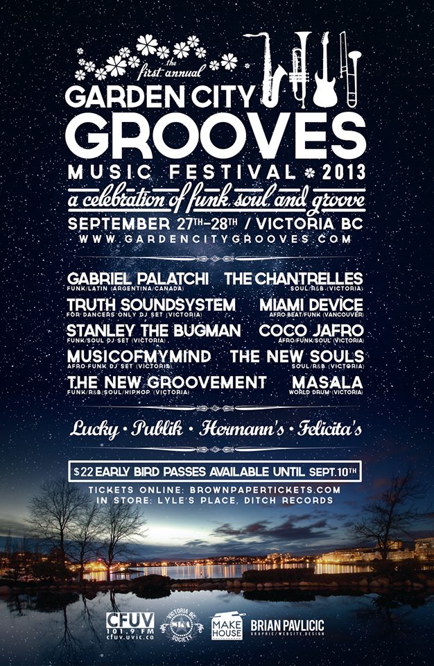 Garden City Grooves is a grassroots community event spearheaded by local promoters and groove afficionados, Nathan Ambrose and Groovin’ Reuven Sussman. The aim of GCG is to celebrate groove in all of its many forms (soul, funk, afrobeat, world and latin). While other larger local festivals may include one or two acts from these genres in their line-up, GCG celebrates this music in all of its forms and aims to discover acts from right in our own backyard and from across Canada, the Pacific Northwest and even the world. Spread over two days, four venues and four events, expect harmonious horn sections, pulsating percussion, formidable funk and dynamic rhythms from all over the world.