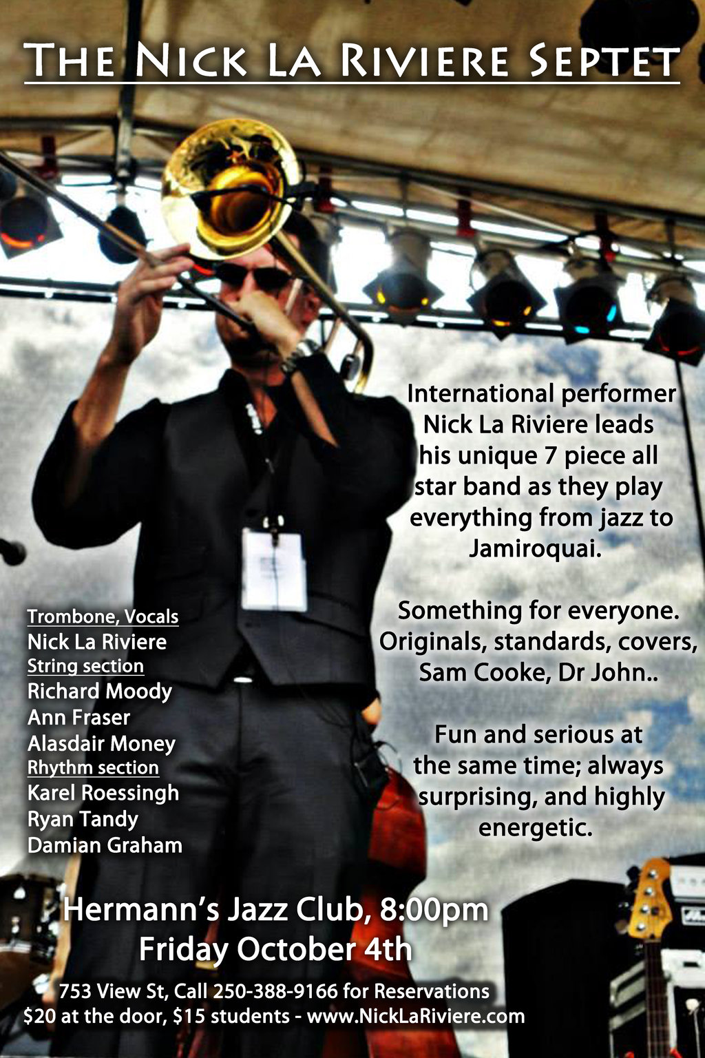 International performer Nick La Riviere has performed all over the world in places like Germany, England, Ireland, Luxembourg, Austria, Switzerland, the USA, and more. He plays regularly with Juno winning band, The Paperboys, as well as many other projects. He's always on the move alternating between performing on the island and elsewhere. On October 4th, Nick's septet takes the stage at Hermann's Jazz Club.. but it's not just jazz. Sure there's a jazz element to the show, but there's a fun funky pop element as well. The show has everything from jazz to Jamiroquai. Originals, standards, covers, the works. Nick sings and plays trombone, and is backed up by some of the finest musicians Victoria has to offer - Richard Moody, violin; Ann Fraser, violin; Alasdair Money, cello; Karel Roessingh, piano; Ryan Tandy, bass; Damian Graham, drums. There's always some great energy and creativity. This is truly a show that has something for everyone, whether you're a serious music listener or just out for fun evening.