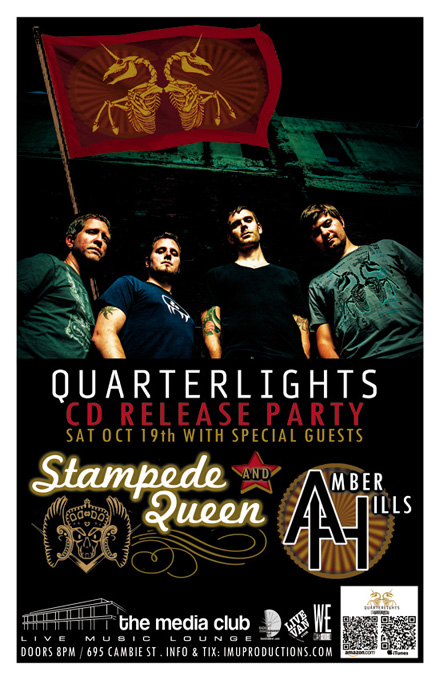 . Saturday, October 19th IMU presents QUARTERLIGHTS CD Release Party w/ STAMPEDE QUEEN & AMBER HILLS @ The Media Club, 695 Cambie St . Doors 8pm . Show 8:30pm sharp / Purchase advance tickets directly via the bands or online @ http://www.imuproductions.com/tix