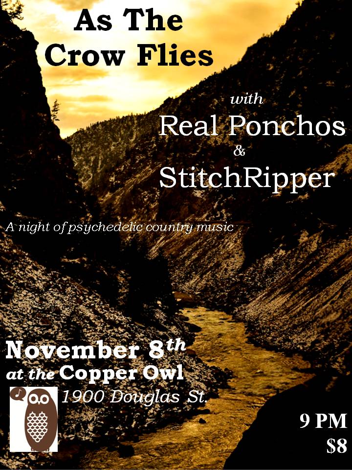Folks, if you dig well played guitars, honest vocals and well crafted tunes you'll thank yourself for making it down to the Copper Owl for this night. It's gonna be a no bullshit night of psychedelic country tunes and good time canadiana. This is the first time Victoria's (asthe) crow flies and Vancouver's Real Ponchos are sharing a bill, and the anticipated match can only provide for harmonious vibes. Joined by the solid StitchRipper, this will be a bona fide humdinger!