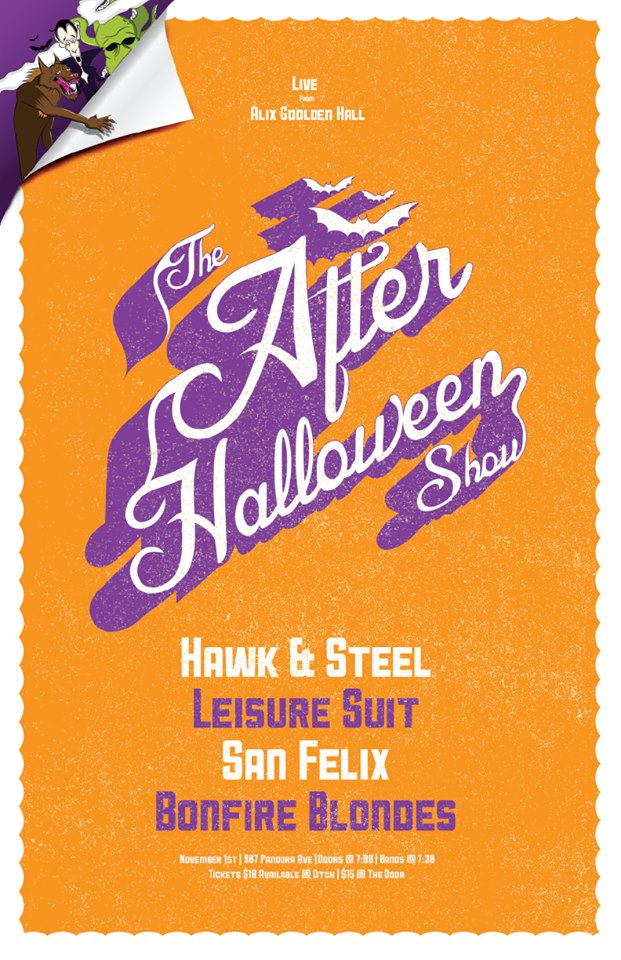 Shake off your hangover and join us for the second annual After Halloween Show, featuring Hawk and Steel, Leisure Suit, San Felix (formerly Dogwood Line), and Bonfire Blondes (Ethan Caleb of the Archers).