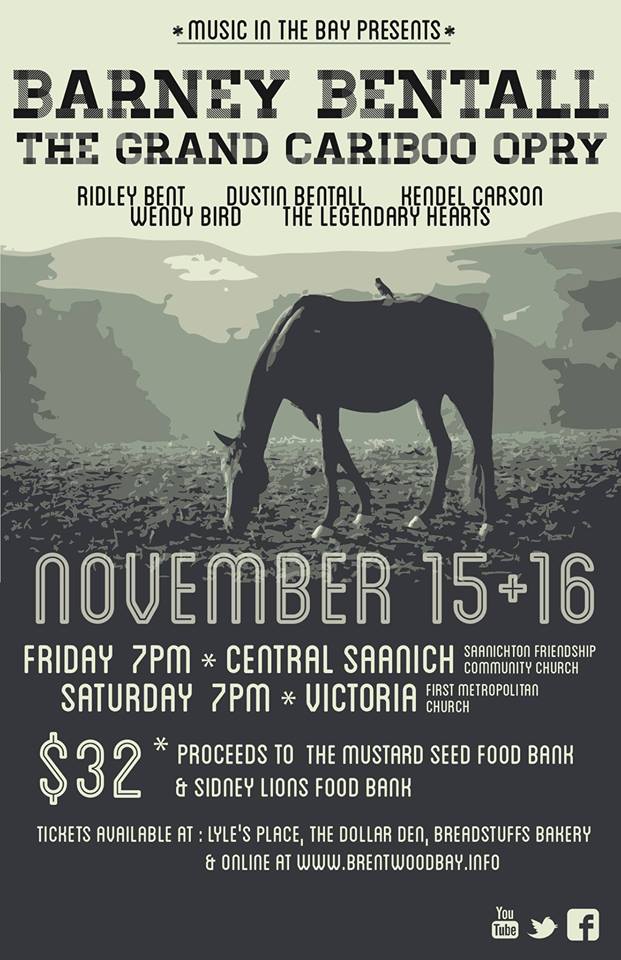 Barney Bentall's Grand Cariboo Opry is riding back into town this year for what has become a great tradition. This will be the 7th annual fundraiser for the Mustard Seed & Sidney Lions Club food banks hosted by Brentwood's Music in the Bay. We have raised almost $50,000 over the past six years, including a record $12,000 last year alone! These shows are more than a concert - they are a highly entertaining blend of humour, featured solos and lively roots, folk and country favourites with the full cast. This year's Opry will feature Victoria's own Kendel Carson, Ridley Bent, Dustin Bentall, Wendy Bird, Angela Harris, Adam Dobres and Matt Masters along with Barney's Legendary Hearts band, Eric Reed, Rob Becker, Geoff Hicks, and Scott Smith – and perhaps a few more surprises!