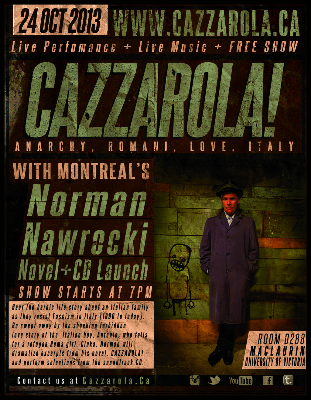 CAZZAROLA! CANADIAN TOUR 2013 is quickly approaching. Begining in October, the acclaimed author/musician/actor Norman Nawrocki will be traveling to a Canadian town near you as he launches his first-ever novel & brand-new soundtrack, both titled, CAZZAROLA, Anarchy, Romani, Love, Italy. Learn about the 130 years-spanning resistance of an Italian family as they engage in heroic resistance to Fascism in Italy and be swept away by the shocking forbidden love story of the Italian boy, Antonio, who falls for a refugee Roma girl, Cinka, as Norman dramatizes excerpts from CAZZAROLA!, playing several characters from the book, and performing selections from the album on his looped and sampled violin. Where possible, the event will also include a round-table discussion with local representatives from Roma and immigrant, refugee, and migrant worker communities.