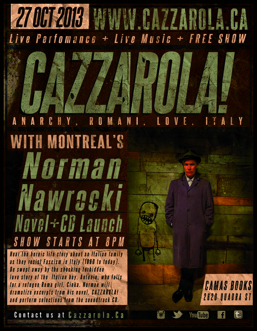 CAZZAROLA! CANADIAN TOUR 2013 is quickly approaching. Begining in October, the acclaimed author/musician/actor Norman Nawrocki will be traveling to a Canadian town near you as he launches his first-ever novel & brand-new soundtrack, both titled, CAZZAROLA, Anarchy, Romani, Love, Italy. Learn about the 130 years-spanning resistance of an Italian family as they engage in heroic resistance to Fascism in Italy and be swept away by the shocking forbidden love story of the Italian boy, Antonio, who falls for a refugee Roma girl, Cinka, as Norman dramatizes excerpts from CAZZAROLA!, playing several characters from the book, and performing selections from the album on his looped and sampled violin. Where possible, the event will also include a round-table discussion with local representatives from Roma and immigrant, refugee, and migrant worker communities.