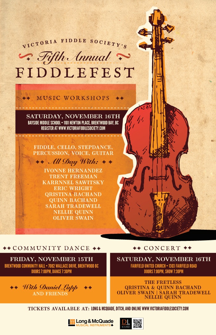 This is an all-star concert on Saturday, November 16th at Fairfield United Church (corner of Fairfield & Moss). The concert will feature the award winning bands The Fretless and Qristina and Quinn Bachand. Other concert performers include Victoria’s quintessential folk musician Oliver Swain, BC fiddle champion Sarah Tradewell and recently back from several years in the UK, Victoria fiddler Nellie Quinn.