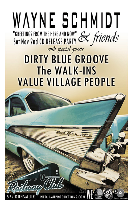 . Saturday, November 2nd IMU presents WAYNE SCHMIDT CD Release Party w/ DIRTY BLUE GROOVE, The WALK-INS & VALUE VILLAGE PEOPLE @ The Railway Club, 579 Dunsmuir . Show 10pm / $10 Cover / Purchase advance tickets online @ http://www.imuproductions.com/tix