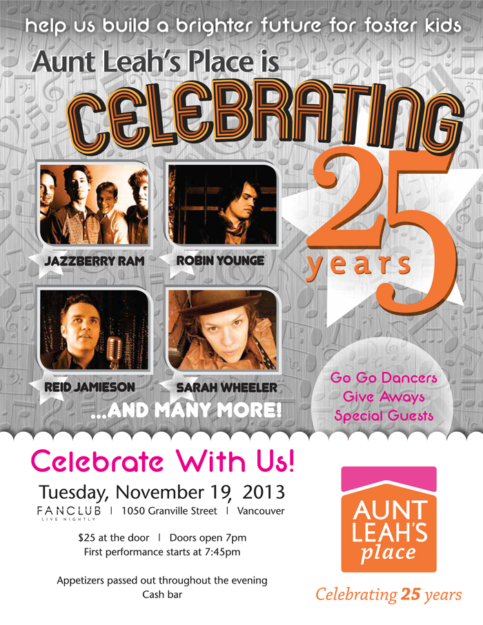 Help us build a brighter future for foster children during Aunt Leah's 25th anniversary. Live performances by Jazzberry Ram, Robin Younge, Reid Jamieson, Sarah Wheeler and many more. Also featuring go-go dancers, giveaways, and appetizers.