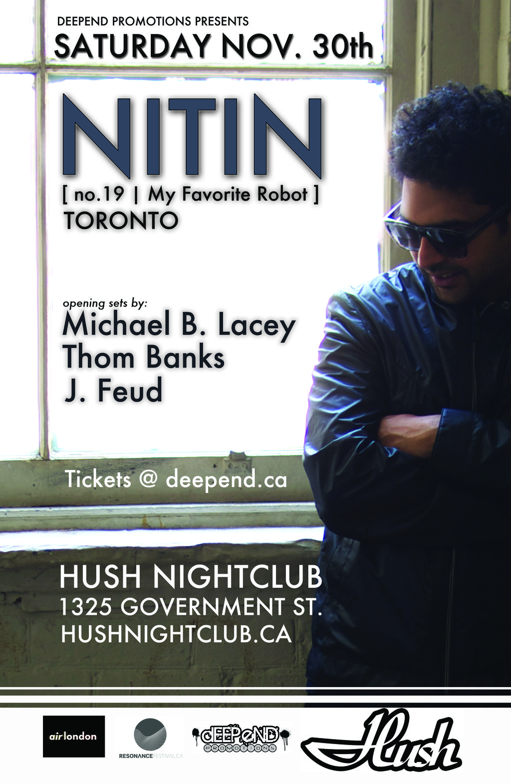 NITIN [ no.19, My Favorite Robot - Toronto ]: DJ NITIN [ no.19 , My Favorite Robot ], Thom Banks, J. Feud, MICHAEL B. LACEY @ Hush Nov 30 2013 - Feb 25th @ Hush