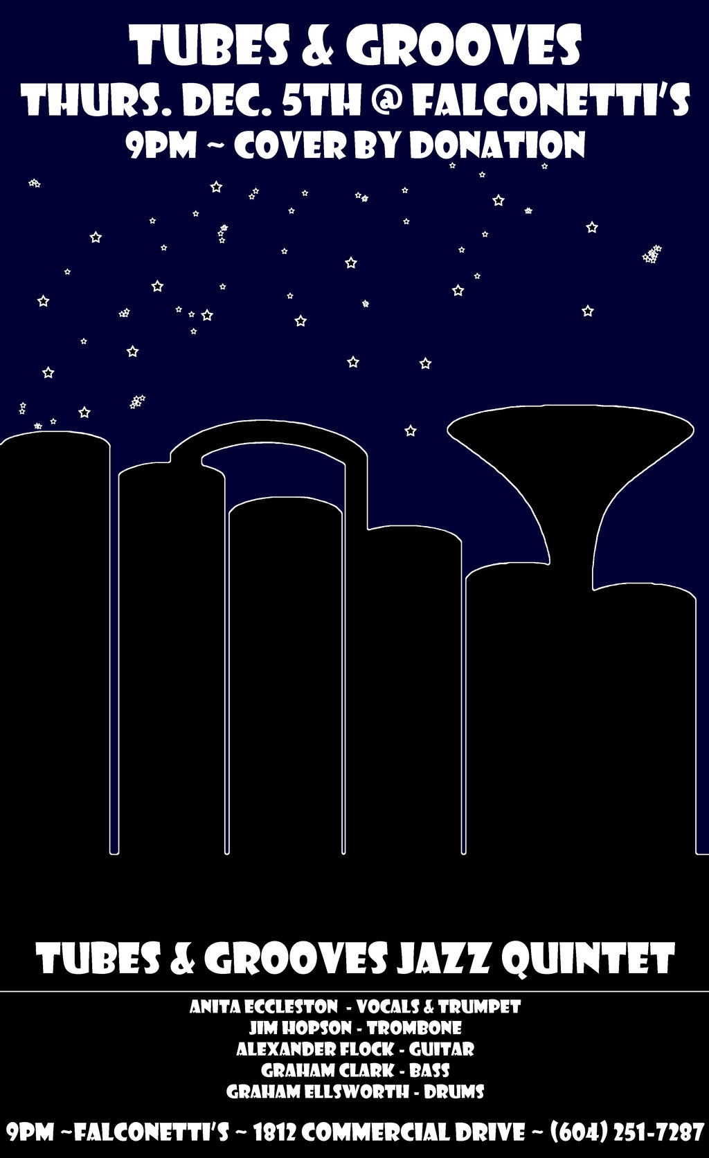 Tubes & Grooves digs deep in the roots of jazz to come out with the heart and soul of the blues, laying funky pockets and crossing over to modern influences, they sound like a traditional jazz band that can step it into high gear and get booties moving on the dance floor.