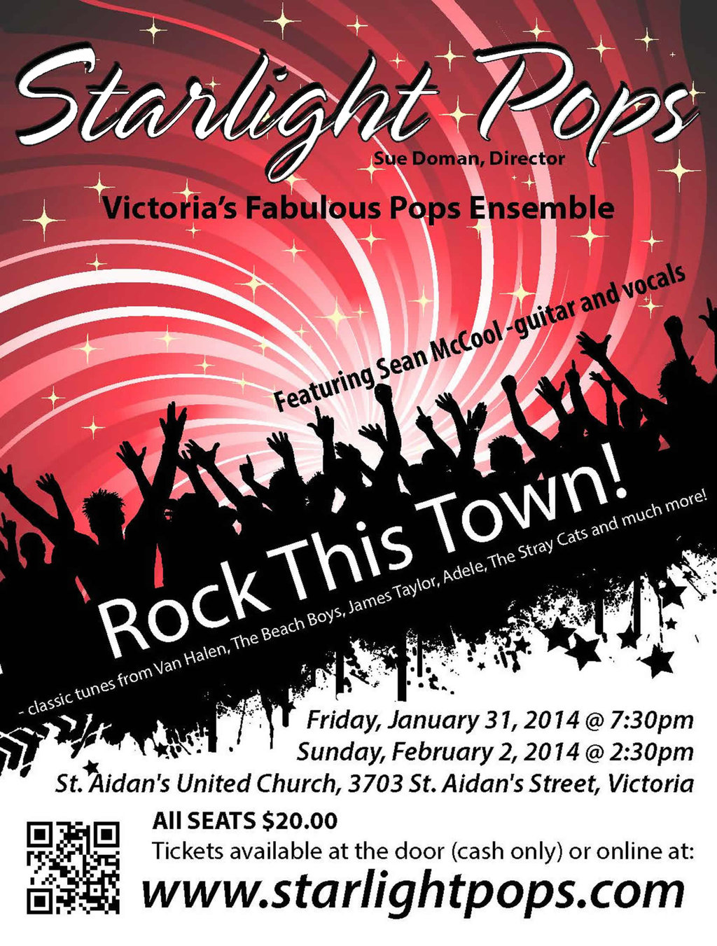 Victoria's fabulous pops ensemble, Starlight Pops, directed by Sue Doman, presents "Rock This Town." With special guest, Sean McCool, on guitar and vocals, the concert features the music of Stevie Wonder, Van Halen, Adele, The Beach Boys, James Taylor, Lionel Richie, Santana, Bob Seger, and many others. Two performances at St. Aidan's: Friday January 31 at 7:30 pm, and Sunday February 2 at 2:30 pm. Tickets: $20, available online at www.starlightpops.com, and at the door (cash only).