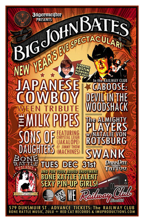 . Tuesday, December 31st IMU & Jagermeister presents BIG JOHN BATES NEW YEAR'S EVE SPECTACULAR! featuring JAPANESE COWBOY Ween Tribute, The MILK PIPES & SONS OF DAUGHTERS + in the Railway's Caboose: DEVIL IN THE WOOD SHACK, The ALMIGHTY PLAYERS featuring Natalie Von Rotsburg & SWANK! Special features also include groovy MC AUSTIN FLOWERS & BONE RATTLE PIN-UP GIRLS! @ The Railway Club, 579 Dunsmuir Street . $15 ADVANCE TICKETS @ THE RAILWAY CLUB UNTIL DEC 30th. $20 cover @ the door on the day of the show.