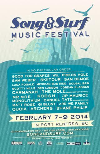 Song and Surf Music Festival Feb 7-9, 2014: Good for Grapes, Wil, Pigeon Hole, Sam Weber, SkiiTour and , Sam Demoe, Luca Fogale, Mexican Bus Ride, Dougal Bain, Scotty Hills Des Larson, Jordan Klassen, Carmanah, The Mole, Mr Moe, KOOSH, JP Maurice, Monolithium, Danuel Tate, Matt Rose, GI Blunt, Are We Family, Quoia, The Archers, Shane Philip