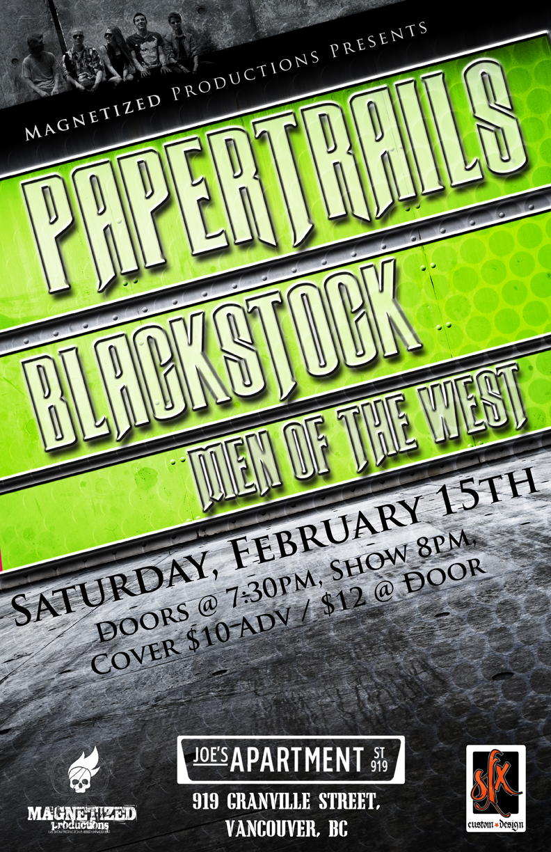 Magnetized Productions Presents: PAPERTRAILS , BLACKSTOCK & MEN OF THE WEST. Saturday, February 15th at Joe's Apartment, 919 Granville Street, Vancouver. Doors @ 7:30pm, Show 8pm, Cover $10 Adv / $12 @ Door