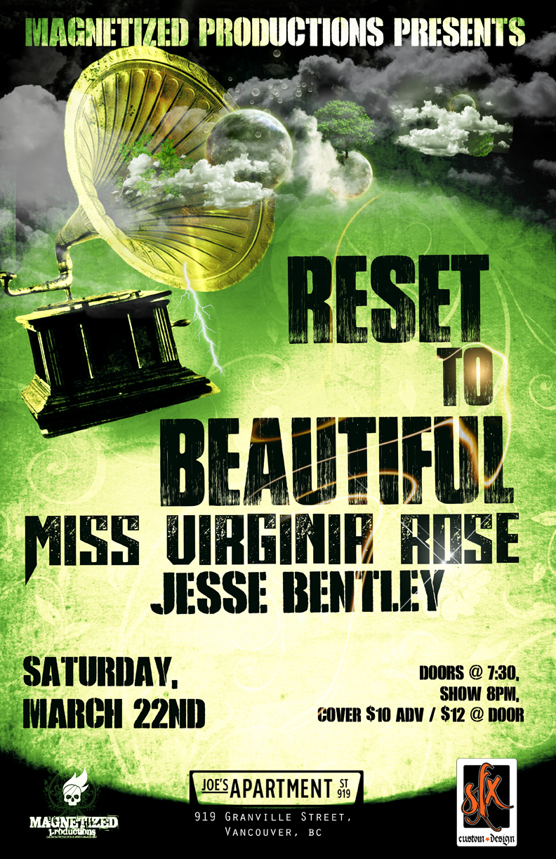 Magnetized Productions Presents: Reset To Beautiful , Miss Virginia Rose & Jesse Bentley Band. Saturday, March 22nd @ Joe's Apartment, 919 Granville Street, Vancouver. Doors @ 7:30, Show 7:45, Cover $10 Adv / $12 @ Door