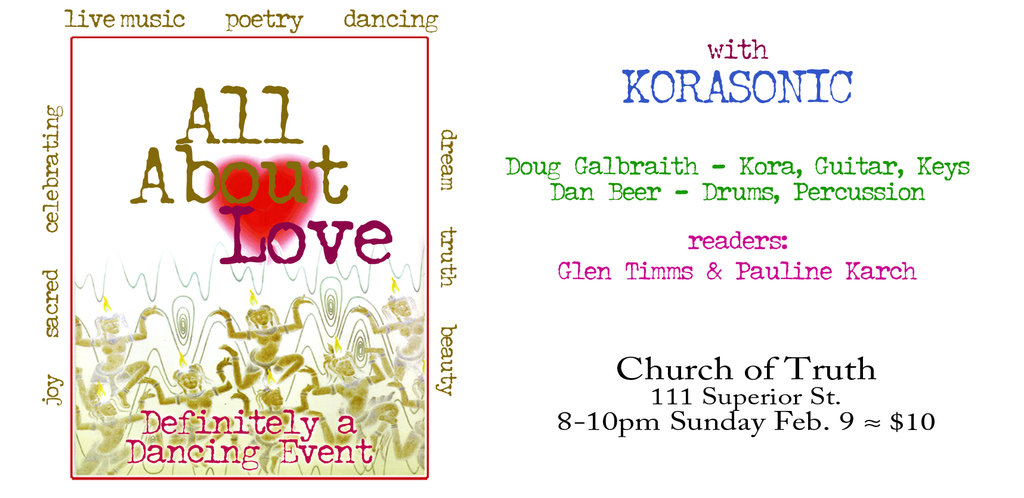 An evening of poetry reading on the various themes of love (for St. Valentine's Day) accompanied by Korasonic, the dynamic duo of multi-instrumentalist Doug Galbraith on Kora, electric guitar and keyboards, and Dan Beer on drums and percussion. They create an electro-acoustic version of world fusion with live sampling. The music and reading will be followed by a full-on dance afterward to round out the night. Poetry readers are Glen Timms and Pauline Karch.