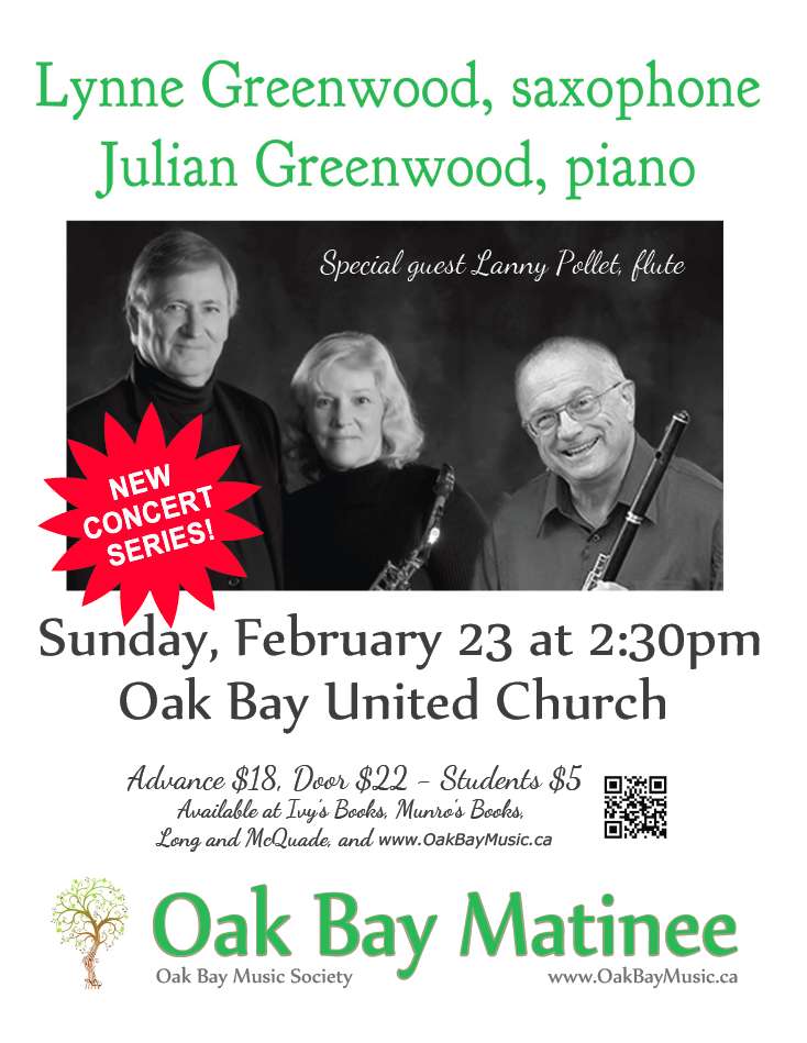 The Oak Bay Matinee concert series features classical music performed by outstanding local and regional performers. The opening concert will be performed by saxophonist Lynne Greenwood, pianist Julian Greenwood, and flutist Lanny Pollet.